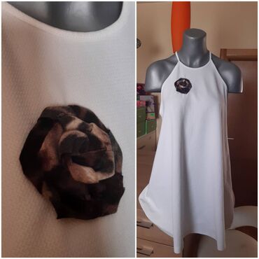 Bela ženska haljina/ tunika A-kroja sa tankim bretelama i sportskim, visoko sečenim raglan-izrezom oko vrata. Napred je dekorativna cvetna aplikacija u braon-kamel tonovima. Materijal je mek i padajući, prijatan za letnje dane. Leđa su blago nabrana/konstruisana sa središnjim šavom za lep pad.