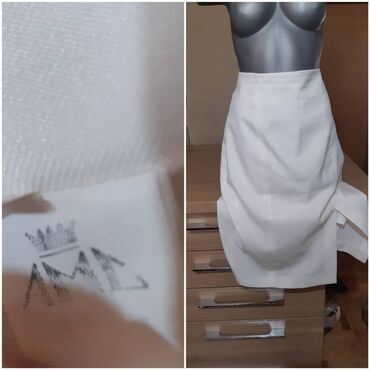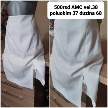 AsimetričnaAMC bela suknja, veličina 38. Elegantna, ravnog kroja sa asimetričnim preklopom/slitom napred. Materijal gladak, postavljena iznutra za lepši pad. Visoki struk, dužina ispod kolena.