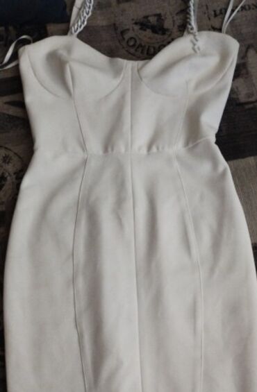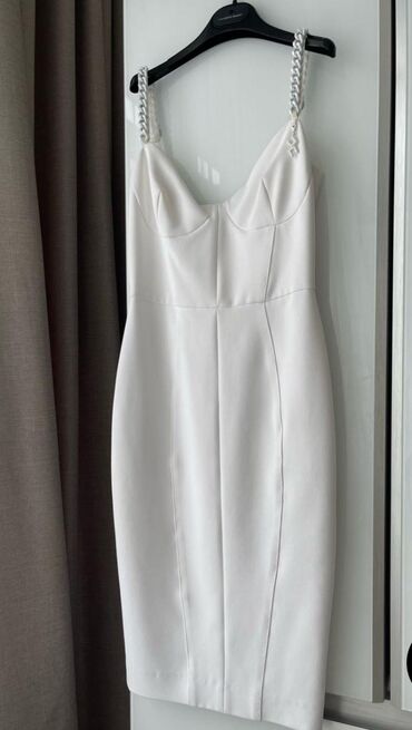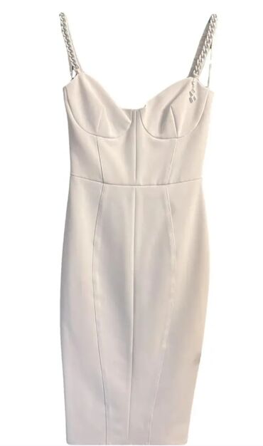 Elegantna bela midi haljina sa oblikovanim korpama i uskim, pripijenim krojem (bodycon silueta). Rame na rame bretele su izvedene kao dekorativan lanac/silver chain, sa sitnim metalnim priveskom. Šavovi za oblikovanje duž prednjeg dela ističu struk i daju čist, sofisticiran izgled. Blago podignut sweetheart izrez, glatka tkanina srednje debljine, bez printa i bez rukava. Idealna za večernje izlaske, proslave i koktel prilike. Neutralna bela nijansa lako se kombinuje sa metalik ili nude aksesoarima.