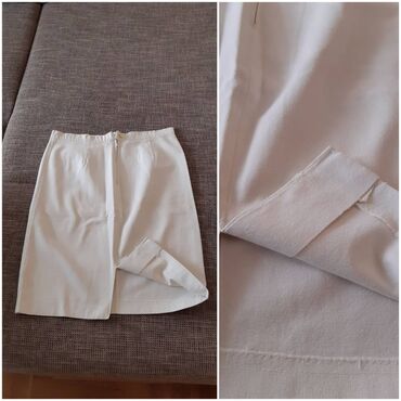 AMC bela suknja, veličina 38. Elegantna, ravnog kroja sa asimetričnim preklopom/slitom napred. Materijal gladak, postavljena iznutra za lepši pad. Visoki struk, dužina ispod kolena. Dimenzije: - P...
