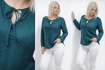 Ženska bluza u tirkizno‑teal nijansi sa sitnim geometrijskim printom (kvadratići).