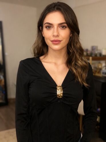 Svečana svetlucava bluza S/M Svečana bluza u bež nijansi, sa izraženim volanom preko ramena koji pada u talasima. Dugi rukavi, rastegljiv materijal sa blagim sjajem, prijatan na dodir. Model nagla...