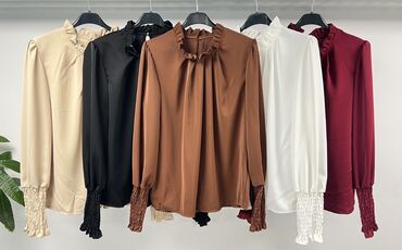 Elegantna ženska bluza sa visokim okovratnikom i dekorativnim naborima. - Model: dugački rukavi sa izraženim manžetnama i zlatnim dugmetom na rukavu - Ramena sa blagim puf efektom - Asimetrično na...