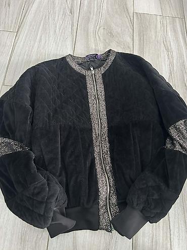 - Materijal: meki baršunasti pliš sa prošivenim panelima na rukavima; detalji od sjajnog, tkanog lureksa uz rajsferšlus, na okovratniku i preko sredine rukava