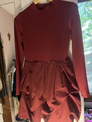 Elegantna bordo haljina sa dugim rukavima i zanimljivim, voluminoznim donjim delom.