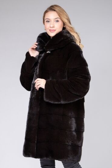 NercŽenska dugačka bunda od nerca u tamnoj boji, idealna za hladnije dane. Dizajn karakteriše horizontalno postavljeno krzno, dugi rukavi i kapuljača koja pruža dodatnu zaštitu od vetra i hladnoće. Kopčanje je diskretno, sa ukrasnom kopčom na vrhu. Elegantan izbor za svečane prilike ili svakodnevno nošenje u zimskim mesecima.