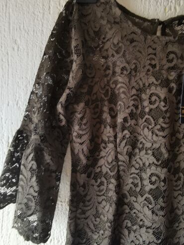 - Materijal: bogata floralna čipka sa postavom ispod, providni detalji na rukavima i rubu