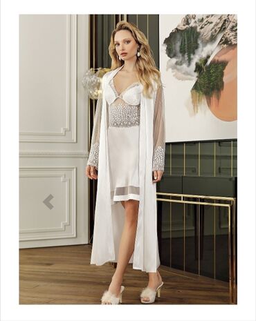 Elegantni ženski set za spavanje/kućnu eleganciju – duga haljina sa ogrtačem - Model: duga, prozirna haljina sa raskošnim, lepršavim rukavima u stilu kimona i produženim šlepom - Materijal: satens...