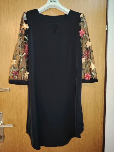 Elegantna crna haljina sa prozirnim rukavima i izvezenim cvetnim motivima