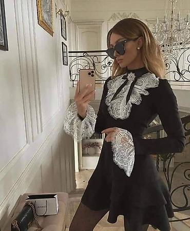 ✅Elegantna ženska mini haljina sa visokim okovratnikom i vezivanjem na leđima. Gornji deo je u kaskadnim, lepršavim naborima koji diskretno prekrivaju torzo, dok je donji deo pripijen i ističe figu...