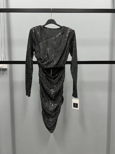Ženska mini haljina sa šljokicama – asimetrični kroj, jedan dugi rukav - Dizajn: jednoranamenica (one-shoulder) sa jednim dugim rukavom i dekorativnim otvorom na struku koji naglašava siluetu. - D...