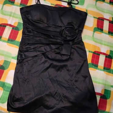 Elegantna crna satenska haljina sa tankim bretelama. Kratak, uski kroj koji prati liniju tela, dužina iznad kolena. Napred ukrasni nabori i velika satenska ruža sa trakicom sa desne strane struka za vizuelno sužavanje struka. Ušivene korpe/grudnjak za bolju formu gornjeg dela. Pozadi skriven rajsferšlus po sredini leđa za lako oblačenje. Materijal glatkog, sjajnog finiša koji lepo pada. Idealna za večernje izlaske, proslave i svečane prilike. Color: crna.