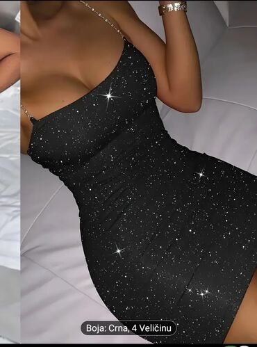 Elegantna mini haljina uskog kroja, idealna za večernje izlaske ili posebne prilike. Haljina je crne boje sa svetlucavim česticama koje joj daju glamurozan izgled. Tanke bretele su ukrašene sitnim cirkonima, dodajući sofisticiran detalj. Dužina haljine je iznad kolena, a materijal je rastegljiv i prijatan za nošenje, prateći liniju tela. Savršen izbor za isticanje figure i postizanje upečatljivog izgleda.