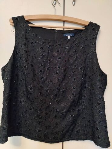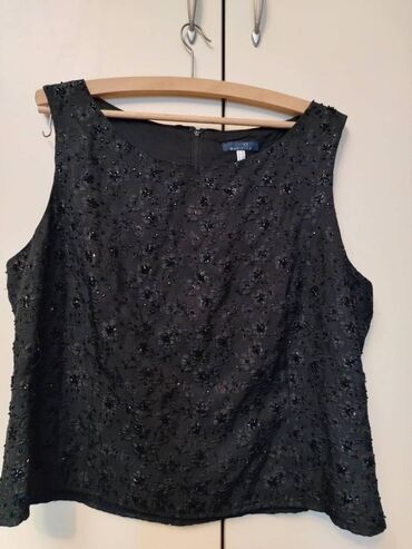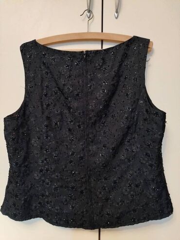 Elegantna ženska top majica u crnoj boji, ukrašena šljokicama i perlama koje formiraju cvetne motive, pružajući sofisticiran i svečan izgled. Dizajn bez rukava i okrugli izrez čine je pogodnom za različite svečane prilike. Majica ima skriveni rajsferšlus na leđima, što olakšava oblačenje i doprinosi urednom izgledu. Idealna je za kombinovanje uz suknje ili pantalone visokog struka za večernje izlaske, proslave ili formalne događaje. Njena tekstura i detalji čine je atraktivnim izborom za dame koje žele da istaknu svoj stil.Materijal je prijatan na dodir i udoban za nošenje, dok je postava od poliestera. Veličina 42.