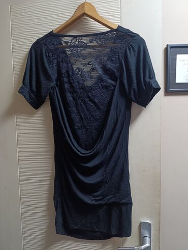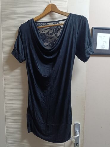 PoliesterCrna ženska tunika/haljina sa kratkim rukavima i drapiranim (vodopad) izrezom napred i nazad. Leđa su delimično od providne čipke sa floralnim motivom, što daje elegantan, ženstven izgled. Donji rub je blago proširen, kroj je uz telo, pogodna za nošenje kao kraća haljina ili duža tunika preko helanki/farmerki.