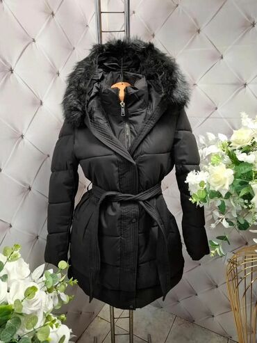 Ženska zimska jakna – crna, prošivena, dužina do iznad kolena. - Topla, punjena, sa horizontalnim prošivima za bolju izolaciju. - Kapuljača ukrašena crnim veštačkim krznom. - Zatvaranje: central...