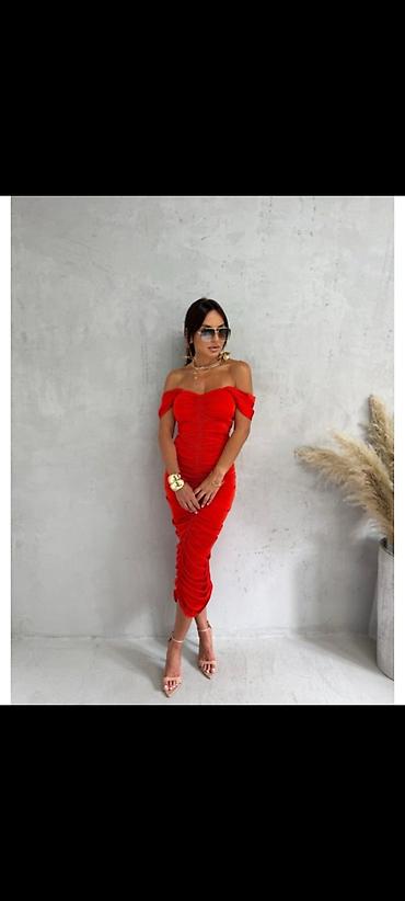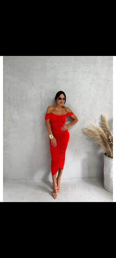 Elegantna koralno crvena midi haljina sa spuštenim ramenima i