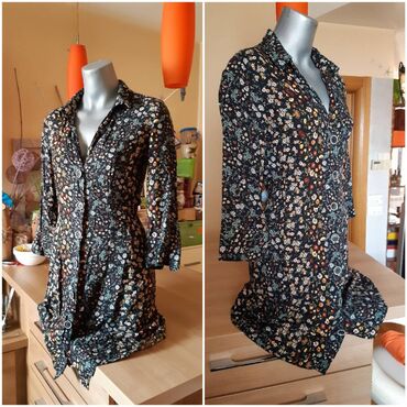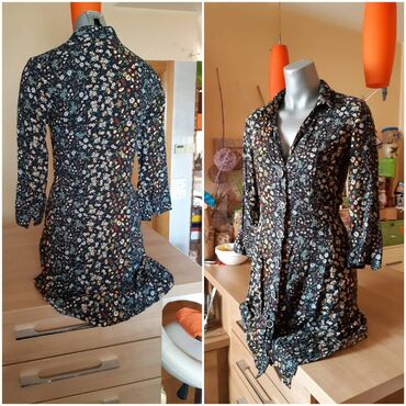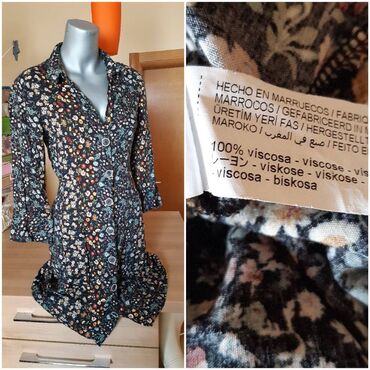 Stradivarius košulja-haljina sa dugmićima duž cele prednje strane. Crna osnova sa sitnim cvetnim printom u više boja. Kragna, blago strukiran kroj, 3/4 rukavi sa blagim zvonom. Donji rub asimetričan sa špicastim završecima. Materijal: 100% viskoza (etiketa prikazana). Proizvedeno u Maroku.