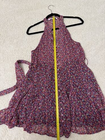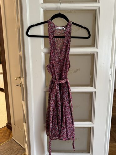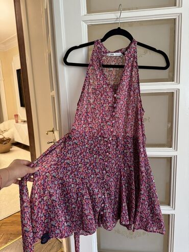 ZARA ženska haljina na bretele sa halter izrezom i strukiranim pojasom za vezivanje. Lagani, prozračni šifon sa sitnim cvetnim printom u nijansama roze, ljubičaste, zelene i narandžaste. Prednji deo sa V-izrezom i dugmadima niz sredinu; leđa blago otvorena sa uskim rameničnim trakama. Donji deo je razigran, sa lepršavim, asimetričnim rubom.