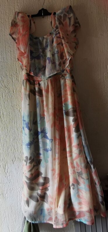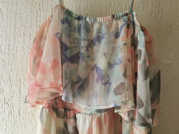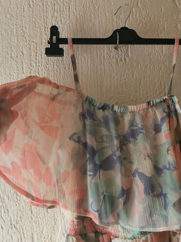 Lagana letnja haljina sa floralnim printom u pastelnim tonovima (roze, mentol, plava i bež). Model je midi dužine, izrađen od prozračnog plisiranog šifona sa postavom. Gornji deo je sa tankim naramenicama i elastičnim izrezom, preko kojeg pada široka, lepršava „cape“ preklop/karner koji pokriva ramena i grudi. Struk je elastičan i prilagodljiv, što naglašava siluetu i pruža udobnost. Suknja je ravno spuštena, meko pada i ima nežan, talasast efekat. Idealna za letnje dane, svečanosti na otvorenom i romantične večernje izlaske.