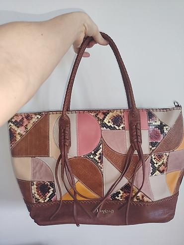 - Prepoznatljiv Desigual patchwork: kombinacija panela u tonovima braon, bež, roze i žute, uz umetke sa efektnim “snake” uzorkom i teksturiranim kožnim motivima