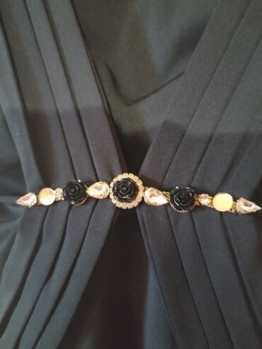 - Detalj: dekorativna aplikacija u struku – kombinacija crnih cvetnih elemenata i kamenčića u zlatnim okvirom, sa providnim kapljastim kristalima; centralni kružni element naglašava struk i vizuelno izdužuje figuru.