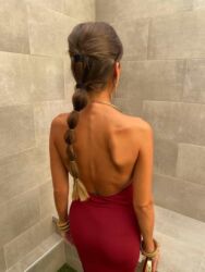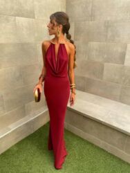 Elegantna, uska duga haljina koja prati liniju tela i blago se širi pri dnu za sofisticiran izgled. Prednji deo krase efektnim drapirani dekolte, dok su leđa potpuno otvorena. Oko vrata se vezuje tankom trakom sa metalnim detaljima, što dodatno naglašava glamurozan stil. Idealna za svečane prilike, koktele i večernje izlazke.