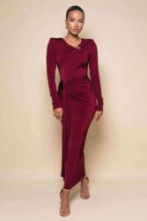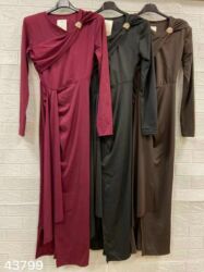 Elegantna duga haljina sa dugim rukavima i asimetričnim preklopom na grudima, ukrašena diskretnom brošem. Model naglašava struk drapiranim naborima i ima efektan padajući panel sa strane koji stvara sofisticiranu siluetu. Dužina do članaka, lagano elastična tkanina koja lepo prati liniju tela.