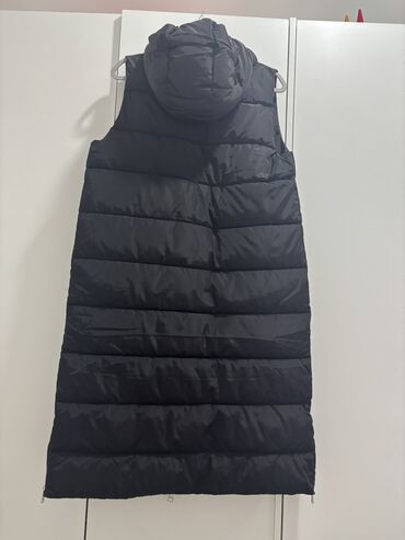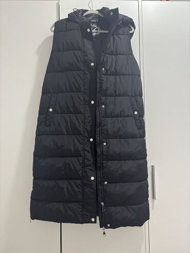 Duga ženska prošivena prsluk-jakna sa kapuljačom, brenda Blind Date (veličina 36/S). Crna boja, topla sintetička ispuna (oznaka “No real down feather” – bez pravog perja).