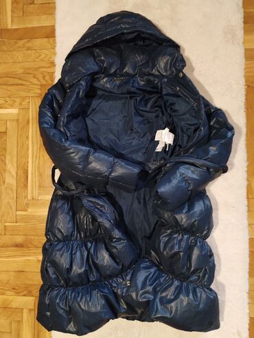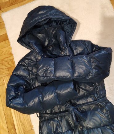 Ženska duga puf jakna sa kapuljačom – tamnoplava