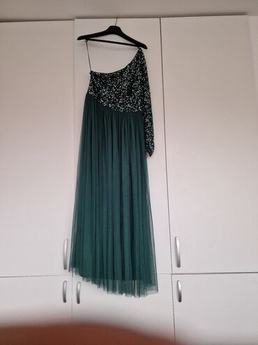 Haljina kombinuje blistav gornji deo i romantičan, prozračan til, pružajući sofisticiran i upečatljiv izgled.