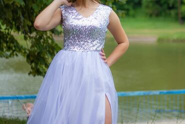 Svečana duga haljina sa šljokičastim gornjim delom i visokim šlicem