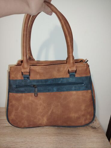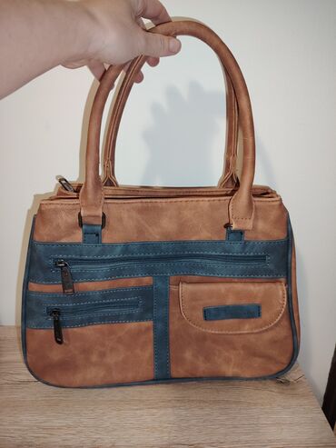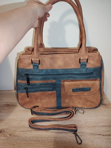 Ženska torba – dvobojna (kamel/teget), sa mnoštvom pregrada i dodatnom dugom kaiš trakom.