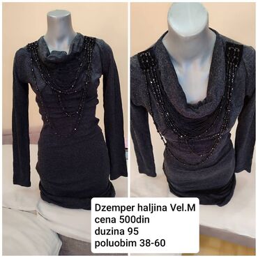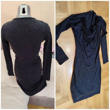 Džemper haljina, veličina M. Tamno siva, pripijeni kroj, dužina 95 cm. Dugi rukavi, kaskadni/lepršavi rol-izrez sa ukrasnim višeslojnim perlama i aplikacijama na ramenima. Elastična tkanina prati liniju tela; poluobim 38–60 cm. Na leđima čista, bez detalja; prednji deo naglašen dekorativnim nizovima. Cena: 500 din.