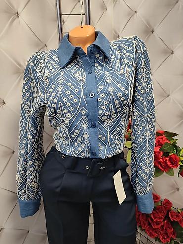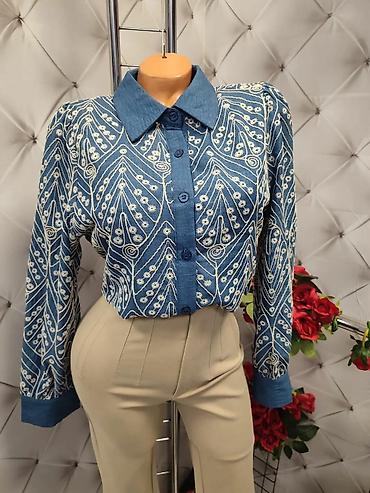 - Model 2 i 4: košulja od tkanine u denim plavoj nijansi sa celopreko izvezenim etno/geometrijskim motivima u svetloj boji. Klasična kragna, vidljivo kopčanje dugmićima u boji košulje, dugi rukavi sa kontrastnim manžetnama. Dve varijante plave (svetlija/tamnija završna obrada).