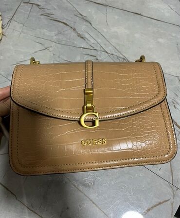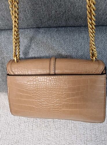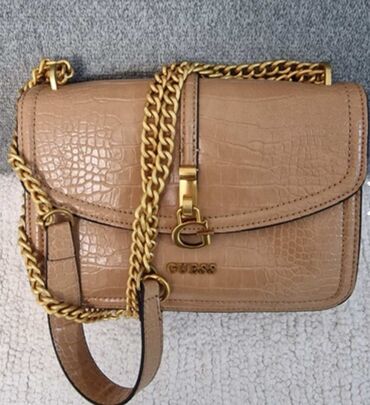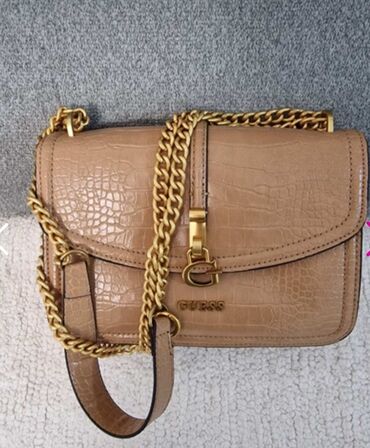 BežModerna ženska torba za nošenje preko ramena, svetlo bež boje, sa prepoznatljivim Guess logom. Torba ima teksturu krokodilske kože, što joj daje sofisticiran izgled. Karakteriše je zlatni lanac koji služi kao kaiš za nošenje i zlatni metalni detalji, uključujući prepoznatljiv Guess logo na prednjoj strani. Glavni odeljak torbe zatvara se preklopom sa metalnom kopčom, a unutrašnjost je prostrana sa dodatnim pregradama. Pogodna je za svakodnevnu upotrebu i dopunjuje različite stilove oblačenja.