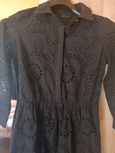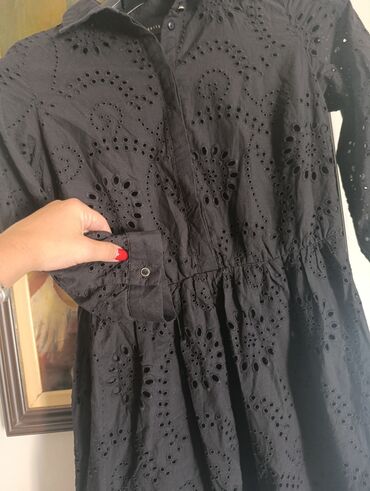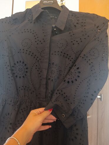 Crna haljina od pamučne čipke (broderie anglaise) sa košulja‑kragnom i skrivenom dugmad-trakom spreda. Rukavi do 3/4 sa manžetnama na dugme. Struk je blago naglašen, donji deo Tkanina je perforirana u ukrasnim, cvetnim i spiralnim motivima duž celog modela, uključujući rukave. Boja: zift crna. Nova na slikama ispada svetla .. Stil: košulja-haljina, midi dužina. Pogodna za svakodnevne i večernje kombinacije, može se no Brend Mura