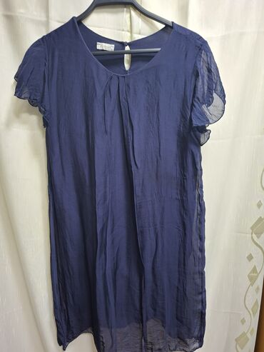 Elegantna tamnoplava haljina od laganog, prozračnog materijala.