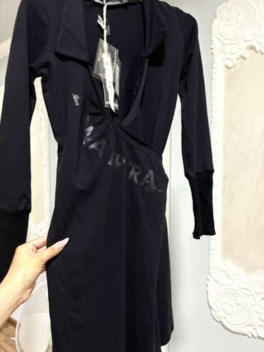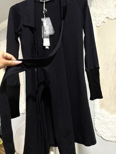 JednobojniCrni dugi kardigan/lagani kaput od mekog rastegljivog materijala. Model sa dugim rukavima i širim rebrastim manžetnama. Otvoren kroj bez dugmadi, sa vezom/pojasom za strukiranje. Kragna sa reverima daje elegantniji izgled. Dužina do iznad kolena, ravna linija koja lepo pada. Idealan za slojevito kombinovanje uz haljine, farmerke ili poslovne kombinacije. Neutralna crna boja, lako uklopiva u svaku garderobu. Na ofingeru sa fabričkim etiketama.
