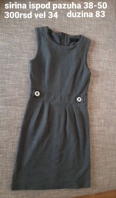 DugmadSivo žensko haljina bez rukava, klasičnog kroja sa okruglim izrezom. Struk je naglašen pojasom sa dekorativnim dugmadima sa obe strane, a suknja blago nabrana ispod pojasa za elegantan pad. Materijal je meki, prijatan pletivasti štof tamnosive boje.