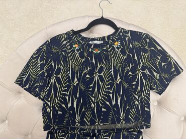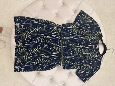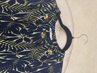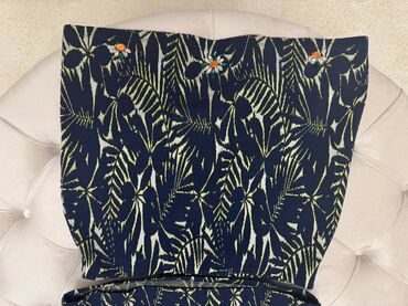 - Boja/dekor: tamnoplava osnova sa apstraktnim/tropskim listastim dezenom u nijansama žute i bele