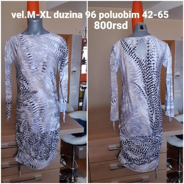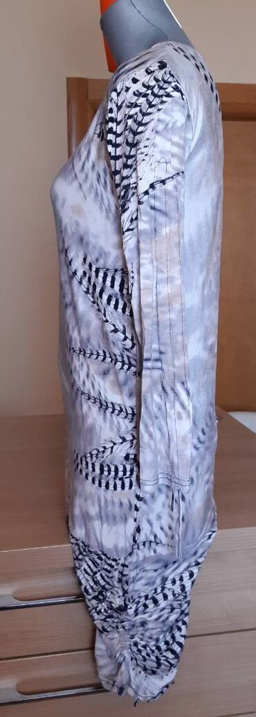 Haljina sa dugim rukavima, sivo-beli print (apstraktni/pero motiv). Rastegljiv materijal, lagan i prijatan uz telo. Model sa blagim naborima i podešavanjem uzice pri dnu za oblikovanje dužine i kroja. Okrugao izrez napred; na leđima kapljica-otvor sa kopčanjem.