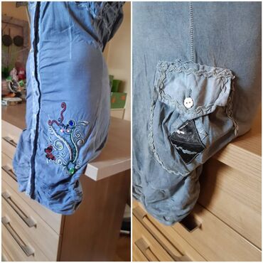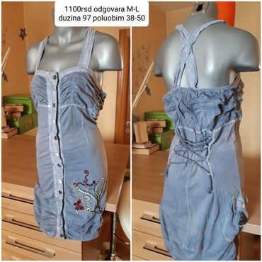 Haljina na bretele, siva/pepelnato plava, dužina 97 cm. Model pripijen uz telo sa dekorativnim naborima sprijeda i straga, kopčanje celom dužinom napred dugmadima. Na leđima vezivanje (korsetski vez) za podešavanje širine. Bočni džep s poklopcem i dugmetom. Asimetrični, blago „naborani“ porub sa strane. Ukrasni vez/aplikacija u boji na donjem delu prednjice. Materijal tanak i mekan, pogodan za leto. Odgovara veličinama M–L, poluobim 38–50 cm. Cena: 1100 RSD.