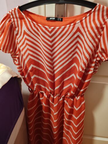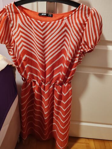 - Detalji: elastični pojas naglašava struk; simetričan šablon pruga vizuelno izdužuje figuru