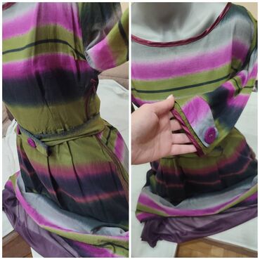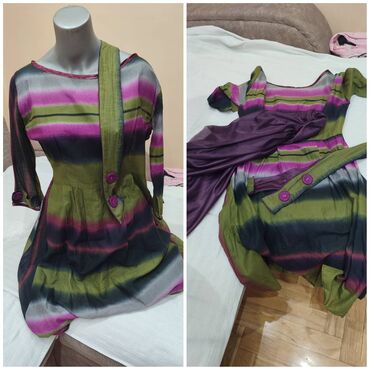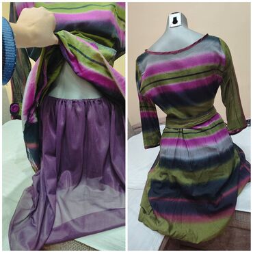 Haljina šivena po meri, sa pratećom podsuknjom od ljubičastog tila. Materijal sa efektom satena, pruge u nijansama zelene, ljubičaste, crne i sive. Gornji deo sa čamcem izrezom i 3/4 rukavima; rukavi imaju ukrasne manžetne sa dugmadima u ljubičastoj boji. Struk naglašen pojasom u istom dezenu sa ukrasnim dugmadima; suknja blago nabrana. Dužina haljine: 90 cm. Poluobim ispod grudi: 49 cm. Poluobim struka: 38 cm. Odgovara veličini M. Cena: 12000.