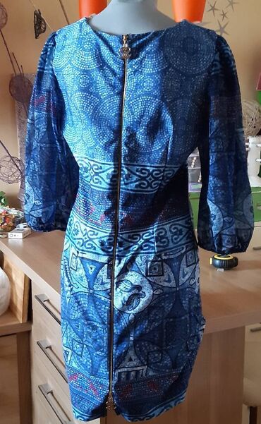Plava haljina sa etno/mozaičkim printom i puf rukavima do ispod lakta. Prednji deo se može nositi na dva načina: