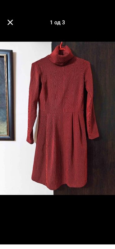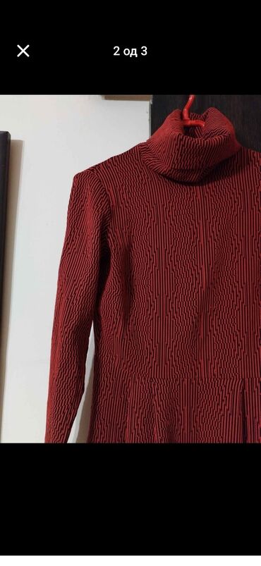 Haljina sa rol-kragnom, bordo-crvena sa crnim geometrijskim/liniearnim dezenom.
