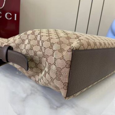 - Materijal: bež/braon monogram platno sa dvostrukim G uzorkom; obrubi, dno i kaiš od zrnaste braon kože