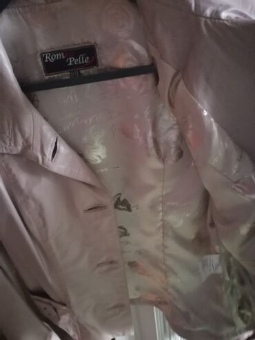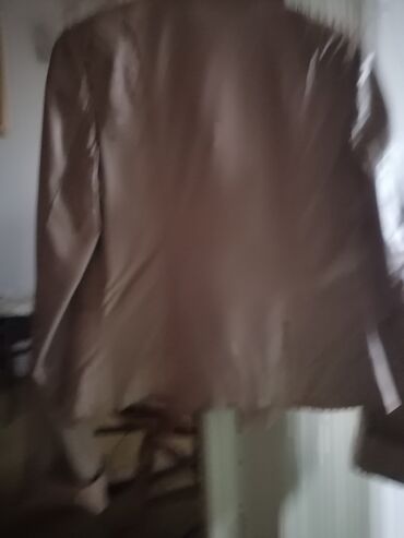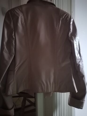 MŽenska kraća jakna/blejzer od prave kože u bež/svetlosmeđoj nijansi. Model sa klasičnim reverima i dugmadima napred, blago strukiran kroj koji prati liniju tela. Rukavi sa manžetnama na preklop. Unutrašnjost je postavljena glatkom, sjajnom postavom sa diskretnim cvetnim i kaligrafskim dezenom. Dužina do kukova, pogodna za kombinovanje uz farmerke, pantalone ili haljine. Na etiketi: Rom Pelle. Elegantna i lagana jakna za proleće/jesen i večernje prilike.