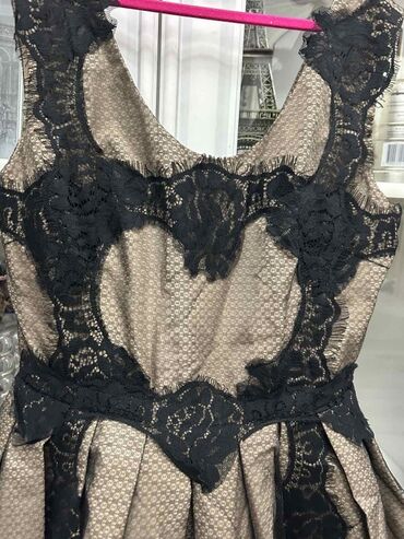 - Detalji: ručno aplicirana crna čipka sa floralnim motivima preko dekoltea, ramena, struka i nizom panela na suknji; čipka oblikuje ženstvenu siluetu i stvara atraktivan kontrast.